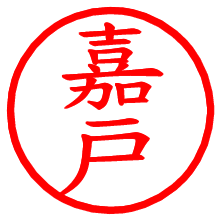 [朱肉の色]を選び、入力窓に“嘉戸”と入力して[生成]ボタンを押すと、印影が更新され、リンクから電子印鑑(デジタル印影)がダウンロードできます。 電子印鑑「嘉戸」の作り方文字表示が変なときや、文字バランスが悪いときは[字形切替]のチェックボックスでON/OFFを切り替え[生成]しなおしてください。 生成される画像は通常の印影「嘉戸.png」と、にじみを表現した少し太めの印影「嘉戸B.png」の背面透過PNG形式2種と、鮮明なPDF形式の印影「嘉戸.pdf」の計3種類です。 朱肉の微妙な色の違いを7色で表現しました。デフォルト(左端)は、JISが定めた朱肉の色のマンセル値(7.5R 5/14)をRGB値(217,66,54)に変換したものになっています。 「電子透かし」にチェックを入れて[生成]ボタンを押すと、タイムスタンプを電子透かしとして埋め込んだセキュアな電子印鑑が作れます。詳細は別ページの「タイムスタンプと電子透かし」でご覧ください。 嘉戸さんの日付印が作れます。「日付スタンプメーカー」は、社内向けの書類に利用されることの多い日付印(データ印)が無料で作れるWebアプリケーションです。中段に日付が入り、上段と下段は、ともに8文字まで文字が入ります。 ![]() 古代文字で落款印が作れます。「落款スタンプメーカー」で作品を引き立たせる落款印が作れます。