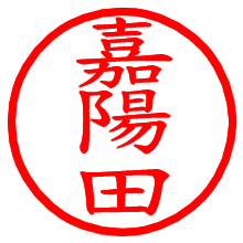 [朱肉の色]を選び、入力窓に“嘉陽田”と入力して[生成]ボタンを押すと、印影が更新され、リンクから電子印鑑(デジタル印影)がダウンロードできます。 電子印鑑「嘉陽田」の作り方文字表示が変なときや、文字バランスが悪いときは[字形切替]のチェックボックスでON/OFFを切り替え[生成]しなおしてください。 生成される画像は通常の印影「嘉陽田.png」と、にじみを表現した少し太めの印影「嘉陽田B.png」の背面透過PNG形式2種と、鮮明なPDF形式の印影「嘉陽田.pdf」の計3種類です。 朱肉の微妙な色の違いを7色で表現しました。デフォルト(左端)は、JISが定めた朱肉の色のマンセル値(7.5R 5/14)をRGB値(217,66,54)に変換したものになっています。 「電子透かし」にチェックを入れて[生成]ボタンを押すと、タイムスタンプを電子透かしとして埋め込んだセキュアな電子印鑑が作れます。詳細は別ページの「タイムスタンプと電子透かし」でご覧ください。 嘉陽田さんの日付印が作れます。「日付スタンプメーカー」は、社内向けの書類に利用されることの多い日付印(データ印)が無料で作れるWebアプリケーションです。中段に日付が入り、上段と下段は、ともに8文字まで文字が入ります。 ![]() 古代文字で落款印が作れます。「落款スタンプメーカー」で作品を引き立たせる落款印が作れます。