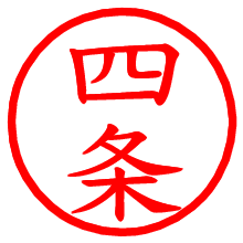 [朱肉の色]を選び、入力窓に“四条”と入力して[生成]ボタンを押すと、印影が更新され、リンクから電子印鑑(デジタル印影)がダウンロードできます。 電子印鑑「四条」の作り方文字表示が変なときや、文字バランスが悪いときは[字形切替]のチェックボックスでON/OFFを切り替え[生成]しなおしてください。 生成される画像は通常の印影「四条.png」と、にじみを表現した少し太めの印影「四条B.png」の背面透過PNG形式2種と、鮮明なPDF形式の印影「四条.pdf」の計3種類です。 朱肉の微妙な色の違いを7色で表現しました。デフォルト(左端)は、JISが定めた朱肉の色のマンセル値(7.5R 5/14)をRGB値(217,66,54)に変換したものになっています。 「電子透かし」にチェックを入れて[生成]ボタンを押すと、タイムスタンプを電子透かしとして埋め込んだセキュアな電子印鑑が作れます。詳細は別ページの「タイムスタンプと電子透かし」でご覧ください。 四条さんの日付印が作れます。「日付スタンプメーカー」は、社内向けの書類に利用されることの多い日付印(データ印)が無料で作れるWebアプリケーションです。中段に日付が入り、上段と下段は、ともに8文字まで文字が入ります。 ![]() 古代文字で落款印が作れます。「落款スタンプメーカー」で作品を引き立たせる落款印が作れます。