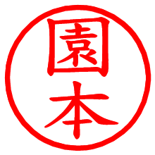 [朱肉の色]を選び、入力窓に“園本”と入力して[生成]ボタンを押すと、印影が更新され、リンクから電子印鑑(デジタル印影)がダウンロードできます。 電子印鑑「園本」の作り方文字表示が変なときや、文字バランスが悪いときは[字形切替]のチェックボックスでON/OFFを切り替え[生成]しなおしてください。 生成される画像は通常の印影「園本.png」と、にじみを表現した少し太めの印影「園本B.png」の背面透過PNG形式2種と、鮮明なPDF形式の印影「園本.pdf」の計3種類です。 朱肉の微妙な色の違いを7色で表現しました。デフォルト(左端)は、JISが定めた朱肉の色のマンセル値(7.5R 5/14)をRGB値(217,66,54)に変換したものになっています。 「電子透かし」にチェックを入れて[生成]ボタンを押すと、タイムスタンプを電子透かしとして埋め込んだセキュアな電子印鑑が作れます。詳細は別ページの「タイムスタンプと電子透かし」でご覧ください。 園本さんの日付印が作れます。「日付スタンプメーカー」は、社内向けの書類に利用されることの多い日付印(データ印)が無料で作れるWebアプリケーションです。中段に日付が入り、上段と下段は、ともに8文字まで文字が入ります。 ![]() 古代文字で落款印が作れます。「落款スタンプメーカー」で作品を引き立たせる落款印が作れます。
