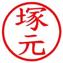 [朱肉の色]を選び、入力窓に“塚元”と入力して[生成]ボタンを押すと、印影が更新され、リンクから電子印鑑(デジタル印影)がダウンロードできます。 電子印鑑「塚元」の作り方文字表示が変なときや、文字バランスが悪いときは[字形切替]のチェックボックスでON/OFFを切り替え[生成]しなおしてください。 生成される画像は通常の印影「塚元.png」と、にじみを表現した少し太めの印影「塚元B.png」の背面透過PNG形式2種と、鮮明なPDF形式の印影「塚元.pdf」の計3種類です。 朱肉の微妙な色の違いを7色で表現しました。デフォルト(左端)は、JISが定めた朱肉の色のマンセル値(7.5R 5/14)をRGB値(217,66,54)に変換したものになっています。 「電子透かし」にチェックを入れて[生成]ボタンを押すと、タイムスタンプを電子透かしとして埋め込んだセキュアな電子印鑑が作れます。詳細は別ページの「タイムスタンプと電子透かし」でご覧ください。 塚元さんの日付印が作れます。「日付スタンプメーカー」は、社内向けの書類に利用されることの多い日付印(データ印)が無料で作れるWebアプリケーションです。中段に日付が入り、上段と下段は、ともに8文字まで文字が入ります。 ![]() 古代文字で落款印が作れます。「落款スタンプメーカー」で作品を引き立たせる落款印が作れます。