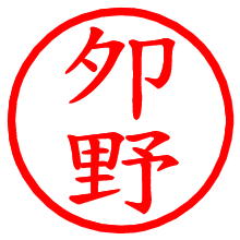 [朱肉の色]を選び、入力窓に“夘野”と入力して[生成]ボタンを押すと、印影が更新され、リンクから電子印鑑(デジタル印影)がダウンロードできます。 電子印鑑「夘野」の作り方文字表示が変なときや、文字バランスが悪いときは[字形切替]のチェックボックスでON/OFFを切り替え[生成]しなおしてください。 生成される画像は通常の印影「夘野.png」と、にじみを表現した少し太めの印影「夘野B.png」の背面透過PNG形式2種と、鮮明なPDF形式の印影「夘野.pdf」の計3種類です。 朱肉の微妙な色の違いを7色で表現しました。デフォルト(左端)は、JISが定めた朱肉の色のマンセル値(7.5R 5/14)をRGB値(217,66,54)に変換したものになっています。 「電子透かし」にチェックを入れて[生成]ボタンを押すと、タイムスタンプを電子透かしとして埋め込んだセキュアな電子印鑑が作れます。詳細は別ページの「タイムスタンプと電子透かし」でご覧ください。 夘野さんの日付印が作れます。「日付スタンプメーカー」は、社内向けの書類に利用されることの多い日付印(データ印)が無料で作れるWebアプリケーションです。中段に日付が入り、上段と下段は、ともに8文字まで文字が入ります。 ![]() 古代文字で落款印が作れます。「落款スタンプメーカー」で作品を引き立たせる落款印が作れます。