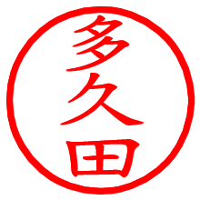 [朱肉の色]を選び、入力窓に“多久田”と入力して[生成]ボタンを押すと、印影が更新され、リンクから電子印鑑(デジタル印影)がダウンロードできます。 電子印鑑「多久田」の作り方文字表示が変なときや、文字バランスが悪いときは[字形切替]のチェックボックスでON/OFFを切り替え[生成]しなおしてください。 生成される画像は通常の印影「多久田.png」と、にじみを表現した少し太めの印影「多久田B.png」の背面透過PNG形式2種と、鮮明なPDF形式の印影「多久田.pdf」の計3種類です。 朱肉の微妙な色の違いを7色で表現しました。デフォルト(左端)は、JISが定めた朱肉の色のマンセル値(7.5R 5/14)をRGB値(217,66,54)に変換したものになっています。 「電子透かし」にチェックを入れて[生成]ボタンを押すと、タイムスタンプを電子透かしとして埋め込んだセキュアな電子印鑑が作れます。詳細は別ページの「タイムスタンプと電子透かし」でご覧ください。 多久田さんの日付印が作れます。「日付スタンプメーカー」は、社内向けの書類に利用されることの多い日付印(データ印)が無料で作れるWebアプリケーションです。中段に日付が入り、上段と下段は、ともに8文字まで文字が入ります。 ![]() 古代文字で落款印が作れます。「落款スタンプメーカー」で作品を引き立たせる落款印が作れます。