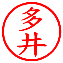 [朱肉の色]を選び、入力窓に“多井”と入力して[生成]ボタンを押すと、印影が更新され、リンクから電子印鑑(デジタル印影)がダウンロードできます。 電子印鑑「多井」の作り方文字表示が変なときや、文字バランスが悪いときは[字形切替]のチェックボックスでON/OFFを切り替え[生成]しなおしてください。 生成される画像は通常の印影「多井.png」と、にじみを表現した少し太めの印影「多井B.png」の背面透過PNG形式2種と、鮮明なPDF形式の印影「多井.pdf」の計3種類です。 朱肉の微妙な色の違いを7色で表現しました。デフォルト(左端)は、JISが定めた朱肉の色のマンセル値(7.5R 5/14)をRGB値(217,66,54)に変換したものになっています。 「電子透かし」にチェックを入れて[生成]ボタンを押すと、タイムスタンプを電子透かしとして埋め込んだセキュアな電子印鑑が作れます。詳細は別ページの「タイムスタンプと電子透かし」でご覧ください。 多井さんの日付印が作れます。「日付スタンプメーカー」は、社内向けの書類に利用されることの多い日付印(データ印)が無料で作れるWebアプリケーションです。中段に日付が入り、上段と下段は、ともに8文字まで文字が入ります。 ![]() 古代文字で落款印が作れます。「落款スタンプメーカー」で作品を引き立たせる落款印が作れます。