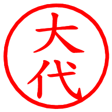 [朱肉の色]を選び、入力窓に“大代”と入力して[生成]ボタンを押すと、印影が更新され、リンクから電子印鑑(デジタル印影)がダウンロードできます。 電子印鑑「大代」の作り方文字表示が変なときや、文字バランスが悪いときは[字形切替]のチェックボックスでON/OFFを切り替え[生成]しなおしてください。 生成される画像は通常の印影「大代.png」と、にじみを表現した少し太めの印影「大代B.png」の背面透過PNG形式2種と、鮮明なPDF形式の印影「大代.pdf」の計3種類です。 朱肉の微妙な色の違いを7色で表現しました。デフォルト(左端)は、JISが定めた朱肉の色のマンセル値(7.5R 5/14)をRGB値(217,66,54)に変換したものになっています。 「電子透かし」にチェックを入れて[生成]ボタンを押すと、タイムスタンプを電子透かしとして埋め込んだセキュアな電子印鑑が作れます。詳細は別ページの「タイムスタンプと電子透かし」でご覧ください。 大代さんの日付印が作れます。「日付スタンプメーカー」は、社内向けの書類に利用されることの多い日付印(データ印)が無料で作れるWebアプリケーションです。中段に日付が入り、上段と下段は、ともに8文字まで文字が入ります。 ![]() 古代文字で落款印が作れます。「落款スタンプメーカー」で作品を引き立たせる落款印が作れます。