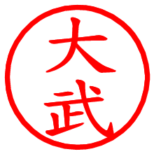 [朱肉の色]を選び、入力窓に“大武”と入力して[生成]ボタンを押すと、印影が更新され、リンクから電子印鑑(デジタル印影)がダウンロードできます。 電子印鑑「大武」の作り方文字表示が変なときや、文字バランスが悪いときは[字形切替]のチェックボックスでON/OFFを切り替え[生成]しなおしてください。 生成される画像は通常の印影「大武.png」と、にじみを表現した少し太めの印影「大武B.png」の背面透過PNG形式2種と、鮮明なPDF形式の印影「大武.pdf」の計3種類です。 朱肉の微妙な色の違いを7色で表現しました。デフォルト(左端)は、JISが定めた朱肉の色のマンセル値(7.5R 5/14)をRGB値(217,66,54)に変換したものになっています。 「電子透かし」にチェックを入れて[生成]ボタンを押すと、タイムスタンプを透かしとして埋め込んだセキュアな電子印鑑が作れます。詳細は別ページの「電子透かしとタイムスタンプ」でご覧ください。  大武さんの日付印が作れます。「日付スタンプメーカー」は、社内向けの書類に利用されることの多い日付印(データ印)が無料で作れるWebアプリケーションです。 中段に日付が入り、上段と下段は、ともに8文字まで文字が入ります。   古代文字で落款印が作れます。「落款スタンプメーカー」で作品を引き立たせる落款印が作れます。  なりきり書道 「落款スタンプメーカー」で作成した落款印の全体的な配置バランスの確認にご利用いただけます。デザインのワンポイントやラインスタンプ等にもお使いください。  遊び心ある大武さんの角印はいかが? 絵文字が使えてLINEスタンプや年賀状にも使える消しゴムはんこ風の電子印鑑が作れます。  画像スタンプメーカーは、猫派の方はもちろん。犬派の方にもおすすめしたいペットなどのお気に入りの画像とかわいいタッチの文字が入るほっこりしたスタンプです。 マイスタンプメーカーとは法的な電子印鑑にはあたりませんので三文判的な位置付けでご利用ください。 | ||