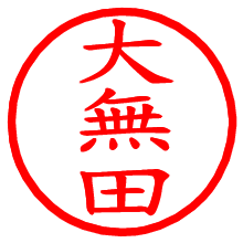 [朱肉の色]を選び、入力窓に“大無田”と入力して[生成]ボタンを押すと、印影が更新され、リンクから電子印鑑(デジタル印影)がダウンロードできます。 電子印鑑「大無田」の作り方文字表示が変なときや、文字バランスが悪いときは[字形切替]のチェックボックスでON/OFFを切り替え[生成]しなおしてください。 生成される画像は通常の印影「大無田.png」と、にじみを表現した少し太めの印影「大無田B.png」の背面透過PNG形式2種と、鮮明なPDF形式の印影「大無田.pdf」の計3種類です。 朱肉の微妙な色の違いを7色で表現しました。デフォルト(左端)は、JISが定めた朱肉の色のマンセル値(7.5R 5/14)をRGB値(217,66,54)に変換したものになっています。 「電子透かし」にチェックを入れて[生成]ボタンを押すと、タイムスタンプを透かしとして埋め込んだセキュアな電子印鑑が作れます。詳細は別ページの「電子透かしとタイムスタンプ」でご覧ください。 大無田さんの日付印が作れます。「日付スタンプメーカー」は、社内向けの書類に利用されることの多い日付印(データ印)が無料で作れるWebアプリケーションです。中段に日付が入り、上段と下段は、ともに8文字まで文字が入ります。 ![]() 古代文字で落款印が作れます。「落款スタンプメーカー」で作品を引き立たせる落款印が作れます。