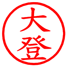 [朱肉の色]を選び、入力窓に“大登”と入力して[生成]ボタンを押すと、印影が更新され、リンクから電子印鑑(デジタル印影)がダウンロードできます。 電子印鑑「大登」の作り方文字表示が変なときや、文字バランスが悪いときは[字形切替]のチェックボックスでON/OFFを切り替え[生成]しなおしてください。 生成される画像は通常の印影「大登.png」と、にじみを表現した少し太めの印影「大登B.png」の背面透過PNG形式2種と、鮮明なPDF形式の印影「大登.pdf」の計3種類です。 朱肉の微妙な色の違いを7色で表現しました。デフォルト(左端)は、JISが定めた朱肉の色のマンセル値(7.5R 5/14)をRGB値(217,66,54)に変換したものになっています。 「電子透かし」にチェックを入れて[生成]ボタンを押すと、タイムスタンプを電子透かしとして埋め込んだセキュアな電子印鑑が作れます。詳細は別ページの「タイムスタンプと電子透かし」でご覧ください。 大登さんの日付印が作れます。「日付スタンプメーカー」は、社内向けの書類に利用されることの多い日付印(データ印)が無料で作れるWebアプリケーションです。中段に日付が入り、上段と下段は、ともに8文字まで文字が入ります。 ![]() 古代文字で落款印が作れます。「落款スタンプメーカー」で作品を引き立たせる落款印が作れます。