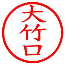 [朱肉の色]を選び、入力窓に“大竹口”と入力して[生成]ボタンを押すと、印影が更新され、リンクから電子印鑑(デジタル印影)がダウンロードできます。 電子印鑑「大竹口」の作り方文字表示が変なときや、文字バランスが悪いときは[字形切替]のチェックボックスでON/OFFを切り替え[生成]しなおしてください。 生成される画像は通常の印影「大竹口.png」と、にじみを表現した少し太めの印影「大竹口B.png」の背面透過PNG形式2種と、鮮明なPDF形式の印影「大竹口.pdf」の計3種類です。 朱肉の微妙な色の違いを7色で表現しました。デフォルト(左端)は、JISが定めた朱肉の色のマンセル値(7.5R 5/14)をRGB値(217,66,54)に変換したものになっています。 「電子透かし」にチェックを入れて[生成]ボタンを押すと、タイムスタンプを電子透かしとして埋め込んだセキュアな電子印鑑が作れます。詳細は別ページの「タイムスタンプと電子透かし」でご覧ください。 大竹口さんの日付印が作れます。「日付スタンプメーカー」は、社内向けの書類に利用されることの多い日付印(データ印)が無料で作れるWebアプリケーションです。中段に日付が入り、上段と下段は、ともに8文字まで文字が入ります。 ![]() 古代文字で落款印が作れます。「落款スタンプメーカー」で作品を引き立たせる落款印が作れます。
