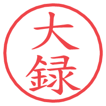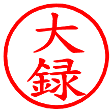 [朱肉の色]を選び、入力窓に“大録”と入力して[生成]ボタンを押すと、印影が更新され、リンクから電子印鑑(デジタル印影)がダウンロードできます。 電子印鑑「大録」の作り方文字表示が変なときや、文字バランスが悪いときは[字形切替]のチェックボックスでON/OFFを切り替え[生成]しなおしてください。 生成される画像は通常の印影「大録.png」と、にじみを表現した少し太めの印影「大録B.png」の背面透過PNG形式2種と、鮮明なPDF形式の印影「大録.pdf」の計3種類です。 朱肉の微妙な色の違いを7色で表現しました。デフォルト(左端)は、JISが定めた朱肉の色のマンセル値(7.5R 5/14)をRGB値(217,66,54)に変換したものになっています。 「電子透かし」にチェックを入れて[生成]ボタンを押すと、タイムスタンプを電子透かしとして埋め込んだセキュアな電子印鑑が作れます。詳細は別ページの「タイムスタンプと電子透かし」でご覧ください。 大録さんの日付印が作れます。「日付スタンプメーカー」は、社内向けの書類に利用されることの多い日付印(データ印)が無料で作れるWebアプリケーションです。中段に日付が入り、上段と下段は、ともに8文字まで文字が入ります。 ![]() 古代文字で落款印が作れます。「落款スタンプメーカー」で作品を引き立たせる落款印が作れます。