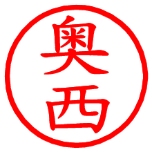 [朱肉の色]を選び、入力窓に“奥西”と入力して[生成]ボタンを押すと、印影が更新され、リンクから電子印鑑(デジタル印影)がダウンロードできます。 電子印鑑「奥西」の作り方文字表示が変なときや、文字バランスが悪いときは[字形切替]のチェックボックスでON/OFFを切り替え[生成]しなおしてください。 生成される画像は通常の印影「奥西.png」と、にじみを表現した少し太めの印影「奥西B.png」の背面透過PNG形式2種と、鮮明なPDF形式の印影「奥西.pdf」の計3種類です。 朱肉の微妙な色の違いを7色で表現しました。デフォルト(左端)は、JISが定めた朱肉の色のマンセル値(7.5R 5/14)をRGB値(217,66,54)に変換したものになっています。 「電子透かし」にチェックを入れて[生成]ボタンを押すと、タイムスタンプを透かしとして埋め込んだセキュアな電子印鑑が作れます。詳細は別ページの「電子透かしとタイムスタンプ」でご覧ください。 奥西さんの日付印が作れます。「日付スタンプメーカー」は、社内向けの書類に利用されることの多い日付印(データ印)が無料で作れるWebアプリケーションです。中段に日付が入り、上段と下段は、ともに8文字まで文字が入ります。 ![]() 古代文字で落款印が作れます。「落款スタンプメーカー」で作品を引き立たせる落款印が作れます。