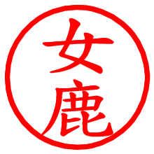 [朱肉の色]を選び、入力窓に“女鹿”と入力して[生成]ボタンを押すと、印影が更新され、リンクから電子印鑑(デジタル印影)がダウンロードできます。 電子印鑑「女鹿」の作り方文字表示が変なときや、文字バランスが悪いときは[字形切替]のチェックボックスでON/OFFを切り替え[生成]しなおしてください。 生成される画像は通常の印影「女鹿.png」と、にじみを表現した少し太めの印影「女鹿B.png」の背面透過PNG形式2種と、鮮明なPDF形式の印影「女鹿.pdf」の計3種類です。 朱肉の微妙な色の違いを7色で表現しました。デフォルト(左端)は、JISが定めた朱肉の色のマンセル値(7.5R 5/14)をRGB値(217,66,54)に変換したものになっています。 「電子透かし」にチェックを入れて[生成]ボタンを押すと、タイムスタンプを電子透かしとして埋め込んだセキュアな電子印鑑が作れます。詳細は別ページの「タイムスタンプと電子透かし」でご覧ください。 女鹿さんの日付印が作れます。「日付スタンプメーカー」は、社内向けの書類に利用されることの多い日付印(データ印)が無料で作れるWebアプリケーションです。中段に日付が入り、上段と下段は、ともに8文字まで文字が入ります。 ![]() 古代文字で落款印が作れます。「落款スタンプメーカー」で作品を引き立たせる落款印が作れます。
