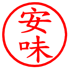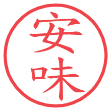 [朱肉の色]を選び、入力窓に“安味”と入力して[生成]ボタンを押すと、印影が更新され、リンクから電子印鑑(デジタル印影)がダウンロードできます。 電子印鑑「安味」の作り方文字表示が変なときや、文字バランスが悪いときは[字形切替]のチェックボックスでON/OFFを切り替え[生成]しなおしてください。 生成される画像は通常の印影「安味.png」と、にじみを表現した少し太めの印影「安味B.png」の背面透過PNG形式2種と、鮮明なPDF形式の印影「安味.pdf」の計3種類です。 朱肉の微妙な色の違いを7色で表現しました。デフォルト(左端)は、JISが定めた朱肉の色のマンセル値(7.5R 5/14)をRGB値(217,66,54)に変換したものになっています。 「電子透かし」にチェックを入れて[生成]ボタンを押すと、タイムスタンプを電子透かしとして埋め込んだセキュアな電子印鑑が作れます。詳細は別ページの「タイムスタンプと電子透かし」でご覧ください。 安味さんの日付印が作れます。「日付スタンプメーカー」は、社内向けの書類に利用されることの多い日付印(データ印)が無料で作れるWebアプリケーションです。中段に日付が入り、上段と下段は、ともに8文字まで文字が入ります。 ![]() 古代文字で落款印が作れます。「落款スタンプメーカー」で作品を引き立たせる落款印が作れます。