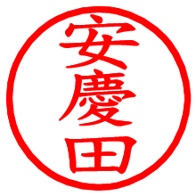 [朱肉の色]を選び、入力窓に“安慶田”と入力して[生成]ボタンを押すと、印影が更新され、リンクから電子印鑑(デジタル印影)がダウンロードできます。 電子印鑑「安慶田」の作り方文字表示が変なときや、文字バランスが悪いときは[字形切替]のチェックボックスでON/OFFを切り替え[生成]しなおしてください。 生成される画像は通常の印影「安慶田.png」と、にじみを表現した少し太めの印影「安慶田B.png」の背面透過PNG形式2種と、鮮明なPDF形式の印影「安慶田.pdf」の計3種類です。 朱肉の微妙な色の違いを7色で表現しました。デフォルト(左端)は、JISが定めた朱肉の色のマンセル値(7.5R 5/14)をRGB値(217,66,54)に変換したものになっています。 「電子透かし」にチェックを入れて[生成]ボタンを押すと、タイムスタンプを電子透かしとして埋め込んだセキュアな電子印鑑が作れます。詳細は別ページの「タイムスタンプと電子透かし」でご覧ください。 安慶田さんの日付印が作れます。「日付スタンプメーカー」は、社内向けの書類に利用されることの多い日付印(データ印)が無料で作れるWebアプリケーションです。中段に日付が入り、上段と下段は、ともに8文字まで文字が入ります。 ![]() 古代文字で落款印が作れます。「落款スタンプメーカー」で作品を引き立たせる落款印が作れます。