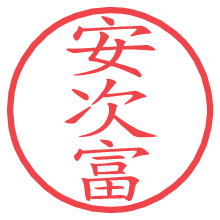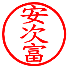[朱肉の色]を選び、入力窓に“安次富”と入力して[生成]ボタンを押すと、印影が更新され、リンクから電子印鑑(デジタル印影)がダウンロードできます。 電子印鑑「安次富」の作り方文字表示が変なときや、文字バランスが悪いときは[字形切替]のチェックボックスでON/OFFを切り替え[生成]しなおしてください。 生成される画像は通常の印影「安次富.png」と、にじみを表現した少し太めの印影「安次富B.png」の背面透過PNG形式2種と、鮮明なPDF形式の印影「安次富.pdf」の計3種類です。 朱肉の微妙な色の違いを7色で表現しました。デフォルト(左端)は、JISが定めた朱肉の色のマンセル値(7.5R 5/14)をRGB値(217,66,54)に変換したものになっています。 「電子透かし」にチェックを入れて[生成]ボタンを押すと、タイムスタンプを電子透かしとして埋め込んだセキュアな電子印鑑が作れます。詳細は別ページの「タイムスタンプと電子透かし」でご覧ください。 安次富さんの日付印が作れます。「日付スタンプメーカー」は、社内向けの書類に利用されることの多い日付印(データ印)が無料で作れるWebアプリケーションです。中段に日付が入り、上段と下段は、ともに8文字まで文字が入ります。 ![]() 古代文字で落款印が作れます。「落款スタンプメーカー」で作品を引き立たせる落款印が作れます。
