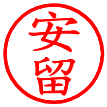[朱肉の色]を選び、入力窓に“安留”と入力して[生成]ボタンを押すと、印影が更新され、リンクから電子印鑑(デジタル印影)がダウンロードできます。 電子印鑑「安留」の作り方文字表示が変なときや、文字バランスが悪いときは[字形切替]のチェックボックスでON/OFFを切り替え[生成]しなおしてください。 生成される画像は通常の印影「安留.png」と、にじみを表現した少し太めの印影「安留B.png」の背面透過PNG形式2種と、鮮明なPDF形式の印影「安留.pdf」の計3種類です。 朱肉の微妙な色の違いを7色で表現しました。デフォルト(左端)は、JISが定めた朱肉の色のマンセル値(7.5R 5/14)をRGB値(217,66,54)に変換したものになっています。 「電子透かし」にチェックを入れて[生成]ボタンを押すと、タイムスタンプを電子透かしとして埋め込んだセキュアな電子印鑑が作れます。詳細は別ページの「タイムスタンプと電子透かし」でご覧ください。 安留さんの日付印が作れます。「日付スタンプメーカー」は、社内向けの書類に利用されることの多い日付印(データ印)が無料で作れるWebアプリケーションです。中段に日付が入り、上段と下段は、ともに8文字まで文字が入ります。 ![]() 古代文字で落款印が作れます。「落款スタンプメーカー」で作品を引き立たせる落款印が作れます。