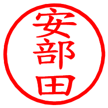 [朱肉の色]を選び、入力窓に“安部田”と入力して[生成]ボタンを押すと、印影が更新され、リンクから電子印鑑(デジタル印影)がダウンロードできます。 電子印鑑「安部田」の作り方文字表示が変なときや、文字バランスが悪いときは[字形切替]のチェックボックスでON/OFFを切り替え[生成]しなおしてください。 生成される画像は通常の印影「安部田.png」と、にじみを表現した少し太めの印影「安部田B.png」の背面透過PNG形式2種と、鮮明なPDF形式の印影「安部田.pdf」の計3種類です。 朱肉の微妙な色の違いを7色で表現しました。デフォルト(左端)は、JISが定めた朱肉の色のマンセル値(7.5R 5/14)をRGB値(217,66,54)に変換したものになっています。 「電子透かし」にチェックを入れて[生成]ボタンを押すと、タイムスタンプを透かしとして埋め込んだセキュアな電子印鑑が作れます。詳細は別ページの「電子透かしとタイムスタンプ」でご覧ください。 安部田さんの日付印が作れます。「日付スタンプメーカー」は、社内向けの書類に利用されることの多い日付印(データ印)が無料で作れるWebアプリケーションです。中段に日付が入り、上段と下段は、ともに8文字まで文字が入ります。 ![]() 古代文字で落款印が作れます。「落款スタンプメーカー」で作品を引き立たせる落款印が作れます。