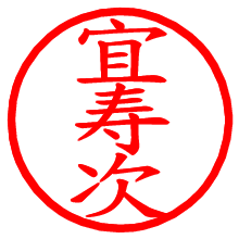 [朱肉の色]を選び、入力窓に“宜寿次”と入力して[生成]ボタンを押すと、印影が更新され、リンクから電子印鑑(デジタル印影)がダウンロードできます。 電子印鑑「宜寿次」の作り方文字表示が変なときや、文字バランスが悪いときは[字形切替]のチェックボックスでON/OFFを切り替え[生成]しなおしてください。 生成される画像は通常の印影「宜寿次.png」と、にじみを表現した少し太めの印影「宜寿次B.png」の背面透過PNG形式2種と、鮮明なPDF形式の印影「宜寿次.pdf」の計3種類です。 朱肉の微妙な色の違いを7色で表現しました。デフォルト(左端)は、JISが定めた朱肉の色のマンセル値(7.5R 5/14)をRGB値(217,66,54)に変換したものになっています。 「電子透かし」にチェックを入れて[生成]ボタンを押すと、タイムスタンプを電子透かしとして埋め込んだセキュアな電子印鑑が作れます。詳細は別ページの「タイムスタンプと電子透かし」でご覧ください。 宜寿次さんの日付印が作れます。「日付スタンプメーカー」は、社内向けの書類に利用されることの多い日付印(データ印)が無料で作れるWebアプリケーションです。中段に日付が入り、上段と下段は、ともに8文字まで文字が入ります。 ![]() 古代文字で落款印が作れます。「落款スタンプメーカー」で作品を引き立たせる落款印が作れます。