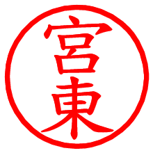 [朱肉の色]を選び、入力窓に“宮東”と入力して[生成]ボタンを押すと、印影が更新され、リンクから電子印鑑(デジタル印影)がダウンロードできます。 電子印鑑「宮東」の作り方文字表示が変なときや、文字バランスが悪いときは[字形切替]のチェックボックスでON/OFFを切り替え[生成]しなおしてください。 生成される画像は通常の印影「宮東.png」と、にじみを表現した少し太めの印影「宮東B.png」の背面透過PNG形式2種と、鮮明なPDF形式の印影「宮東.pdf」の計3種類です。 朱肉の微妙な色の違いを7色で表現しました。デフォルト(左端)は、JISが定めた朱肉の色のマンセル値(7.5R 5/14)をRGB値(217,66,54)に変換したものになっています。 「電子透かし」にチェックを入れて[生成]ボタンを押すと、タイムスタンプを電子透かしとして埋め込んだセキュアな電子印鑑が作れます。詳細は別ページの「タイムスタンプと電子透かし」でご覧ください。 宮東さんの日付印が作れます。「日付スタンプメーカー」は、社内向けの書類に利用されることの多い日付印(データ印)が無料で作れるWebアプリケーションです。中段に日付が入り、上段と下段は、ともに8文字まで文字が入ります。 ![]() 古代文字で落款印が作れます。「落款スタンプメーカー」で作品を引き立たせる落款印が作れます。