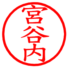 [朱肉の色]を選び、入力窓に“宮谷内”と入力して[生成]ボタンを押すと、印影が更新され、リンクから電子印鑑(デジタル印影)がダウンロードできます。 電子印鑑「宮谷内」の作り方文字表示が変なときや、文字バランスが悪いときは[字形切替]のチェックボックスでON/OFFを切り替え[生成]しなおしてください。 生成される画像は通常の印影「宮谷内.png」と、にじみを表現した少し太めの印影「宮谷内B.png」の背面透過PNG形式2種と、鮮明なPDF形式の印影「宮谷内.pdf」の計3種類です。 朱肉の微妙な色の違いを7色で表現しました。デフォルト(左端)は、JISが定めた朱肉の色のマンセル値(7.5R 5/14)をRGB値(217,66,54)に変換したものになっています。 「電子透かし」にチェックを入れて[生成]ボタンを押すと、タイムスタンプを電子透かしとして埋め込んだセキュアな電子印鑑が作れます。詳細は別ページの「タイムスタンプと電子透かし」でご覧ください。 宮谷内さんの日付印が作れます。「日付スタンプメーカー」は、社内向けの書類に利用されることの多い日付印(データ印)が無料で作れるWebアプリケーションです。中段に日付が入り、上段と下段は、ともに8文字まで文字が入ります。 ![]() 古代文字で落款印が作れます。「落款スタンプメーカー」で作品を引き立たせる落款印が作れます。
