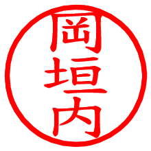 [朱肉の色]を選び、入力窓に“岡垣内”と入力して[生成]ボタンを押すと、印影が更新され、リンクから電子印鑑(デジタル印影)がダウンロードできます。 電子印鑑「岡垣内」の作り方文字表示が変なときや、文字バランスが悪いときは[字形切替]のチェックボックスでON/OFFを切り替え[生成]しなおしてください。 生成される画像は通常の印影「岡垣内.png」と、にじみを表現した少し太めの印影「岡垣内B.png」の背面透過PNG形式2種と、鮮明なPDF形式の印影「岡垣内.pdf」の計3種類です。 朱肉の微妙な色の違いを7色で表現しました。デフォルト(左端)は、JISが定めた朱肉の色のマンセル値(7.5R 5/14)をRGB値(217,66,54)に変換したものになっています。 「電子透かし」にチェックを入れて[生成]ボタンを押すと、タイムスタンプを透かしとして埋め込んだセキュアな電子印鑑が作れます。詳細は別ページの「電子透かしとタイムスタンプ」でご覧ください。  岡垣内さんの日付印が作れます。「日付スタンプメーカー」は、社内向けの書類に利用されることの多い日付印(データ印)が無料で作れるWebアプリケーションです。中段に日付が入り、上段と下段は、ともに8文字まで文字が入ります。 ![]()  古代文字で落款印が作れます。「落款スタンプメーカー」で作品を引き立たせる落款印が作れます。