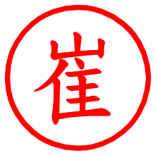 [朱肉の色]を選び、入力窓に“崔”と入力して[生成]ボタンを押すと、印影が更新され、リンクから電子印鑑(デジタル印影)がダウンロードできます。 電子印鑑「崔」の作り方文字表示が変なときや、文字バランスが悪いときは[字形切替]のチェックボックスでON/OFFを切り替え[生成]しなおしてください。 生成される画像は通常の印影「崔.png」と、にじみを表現した少し太めの印影「崔B.png」の背面透過PNG形式2種と、鮮明なPDF形式の印影「崔.pdf」の計3種類です。 朱肉の微妙な色の違いを7色で表現しました。デフォルト(左端)は、JISが定めた朱肉の色のマンセル値(7.5R 5/14)をRGB値(217,66,54)に変換したものになっています。 「電子透かし」にチェックを入れて[生成]ボタンを押すと、タイムスタンプを電子透かしとして埋め込んだセキュアな電子印鑑が作れます。詳細は別ページの「タイムスタンプと電子透かし」でご覧ください。 崔さんの日付印が作れます。「日付スタンプメーカー」は、社内向けの書類に利用されることの多い日付印(データ印)が無料で作れるWebアプリケーションです。中段に日付が入り、上段と下段は、ともに8文字まで文字が入ります。 ![]() 古代文字で落款印が作れます。「落款スタンプメーカー」で作品を引き立たせる落款印が作れます。