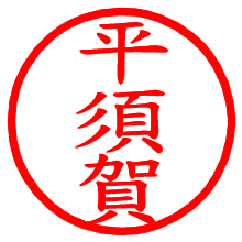 [朱肉の色]を選び、入力窓に“平須賀”と入力して[生成]ボタンを押すと、印影が更新され、リンクから電子印鑑(デジタル印影)がダウンロードできます。 電子印鑑「平須賀」の作り方文字表示が変なときや、文字バランスが悪いときは[字形切替]のチェックボックスでON/OFFを切り替え[生成]しなおしてください。 生成される画像は通常の印影「平須賀.png」と、にじみを表現した少し太めの印影「平須賀B.png」の背面透過PNG形式2種と、鮮明なPDF形式の印影「平須賀.pdf」の計3種類です。 朱肉の微妙な色の違いを7色で表現しました。デフォルト(左端)は、JISが定めた朱肉の色のマンセル値(7.5R 5/14)をRGB値(217,66,54)に変換したものになっています。 「電子透かし」にチェックを入れて[生成]ボタンを押すと、タイムスタンプを電子透かしとして埋め込んだセキュアな電子印鑑が作れます。詳細は別ページの「タイムスタンプと電子透かし」でご覧ください。 平須賀さんの日付印が作れます。「日付スタンプメーカー」は、社内向けの書類に利用されることの多い日付印(データ印)が無料で作れるWebアプリケーションです。中段に日付が入り、上段と下段は、ともに8文字まで文字が入ります。 ![]() 古代文字で落款印が作れます。「落款スタンプメーカー」で作品を引き立たせる落款印が作れます。