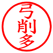 [朱肉の色]を選び、入力窓に“弓削多”と入力して[生成]ボタンを押すと、印影が更新され、リンクから電子印鑑(デジタル印影)がダウンロードできます。 電子印鑑「弓削多」の作り方文字表示が変なときや、文字バランスが悪いときは[字形切替]のチェックボックスでON/OFFを切り替え[生成]しなおしてください。 生成される画像は通常の印影「弓削多.png」と、にじみを表現した少し太めの印影「弓削多B.png」の背面透過PNG形式2種と、鮮明なPDF形式の印影「弓削多.pdf」の計3種類です。 朱肉の微妙な色の違いを7色で表現しました。デフォルト(左端)は、JISが定めた朱肉の色のマンセル値(7.5R 5/14)をRGB値(217,66,54)に変換したものになっています。 「電子透かし」にチェックを入れて[生成]ボタンを押すと、タイムスタンプを電子透かしとして埋め込んだセキュアな電子印鑑が作れます。詳細は別ページの「タイムスタンプと電子透かし」でご覧ください。 弓削多さんの日付印が作れます。「日付スタンプメーカー」は、社内向けの書類に利用されることの多い日付印(データ印)が無料で作れるWebアプリケーションです。中段に日付が入り、上段と下段は、ともに8文字まで文字が入ります。 ![]() 古代文字で落款印が作れます。「落款スタンプメーカー」で作品を引き立たせる落款印が作れます。