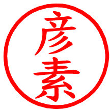 [朱肉の色]を選び、入力窓に“彦素”と入力して[生成]ボタンを押すと、印影が更新され、リンクから電子印鑑(デジタル印影)がダウンロードできます。 電子印鑑「彦素」の作り方文字表示が変なときや、文字バランスが悪いときは[字形切替]のチェックボックスでON/OFFを切り替え[生成]しなおしてください。 生成される画像は通常の印影「彦素.png」と、にじみを表現した少し太めの印影「彦素B.png」の背面透過PNG形式2種と、鮮明なPDF形式の印影「彦素.pdf」の計3種類です。 朱肉の微妙な色の違いを7色で表現しました。デフォルト(左端)は、JISが定めた朱肉の色のマンセル値(7.5R 5/14)をRGB値(217,66,54)に変換したものになっています。 「電子透かし」にチェックを入れて[生成]ボタンを押すと、タイムスタンプを電子透かしとして埋め込んだセキュアな電子印鑑が作れます。詳細は別ページの「タイムスタンプと電子透かし」でご覧ください。 彦素さんの日付印が作れます。「日付スタンプメーカー」は、社内向けの書類に利用されることの多い日付印(データ印)が無料で作れるWebアプリケーションです。中段に日付が入り、上段と下段は、ともに8文字まで文字が入ります。 ![]() 古代文字で落款印が作れます。「落款スタンプメーカー」で作品を引き立たせる落款印が作れます。