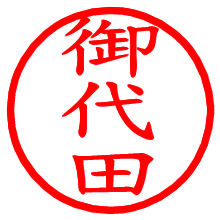 [朱肉の色]を選び、入力窓に“御代田”と入力して[生成]ボタンを押すと、印影が更新され、リンクから電子印鑑(デジタル印影)がダウンロードできます。 電子印鑑「御代田」の作り方文字表示が変なときや、文字バランスが悪いときは[字形切替]のチェックボックスでON/OFFを切り替え[生成]しなおしてください。 生成される画像は通常の印影「御代田.png」と、にじみを表現した少し太めの印影「御代田B.png」の背面透過PNG形式2種と、鮮明なPDF形式の印影「御代田.pdf」の計3種類です。 朱肉の微妙な色の違いを7色で表現しました。デフォルト(左端)は、JISが定めた朱肉の色のマンセル値(7.5R 5/14)をRGB値(217,66,54)に変換したものになっています。 「電子透かし」にチェックを入れて[生成]ボタンを押すと、タイムスタンプを電子透かしとして埋め込んだセキュアな電子印鑑が作れます。詳細は別ページの「タイムスタンプと電子透かし」でご覧ください。 御代田さんの日付印が作れます。「日付スタンプメーカー」は、社内向けの書類に利用されることの多い日付印(データ印)が無料で作れるWebアプリケーションです。中段に日付が入り、上段と下段は、ともに8文字まで文字が入ります。 ![]() 古代文字で落款印が作れます。「落款スタンプメーカー」で作品を引き立たせる落款印が作れます。