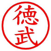 [朱肉の色]を選び、入力窓に“徳武”と入力して[生成]ボタンを押すと、印影が更新され、リンクから電子印鑑(デジタル印影)がダウンロードできます。 電子印鑑「徳武」の作り方文字表示が変なときや、文字バランスが悪いときは[字形切替]のチェックボックスでON/OFFを切り替え[生成]しなおしてください。 生成される画像は通常の印影「徳武.png」と、にじみを表現した少し太めの印影「徳武B.png」の背面透過PNG形式2種と、鮮明なPDF形式の印影「徳武.pdf」の計3種類です。 朱肉の微妙な色の違いを7色で表現しました。デフォルト(左端)は、JISが定めた朱肉の色のマンセル値(7.5R 5/14)をRGB値(217,66,54)に変換したものになっています。 「電子透かし」にチェックを入れて[生成]ボタンを押すと、タイムスタンプを透かしとして埋め込んだセキュアな電子印鑑が作れます。詳細は別ページの「電子透かしとタイムスタンプ」でご覧ください。 徳武さんの日付印が作れます。「日付スタンプメーカー」は、社内向けの書類に利用されることの多い日付印(データ印)が無料で作れるWebアプリケーションです。中段に日付が入り、上段と下段は、ともに8文字まで文字が入ります。 ![]() 古代文字で落款印が作れます。「落款スタンプメーカー」で作品を引き立たせる落款印が作れます。