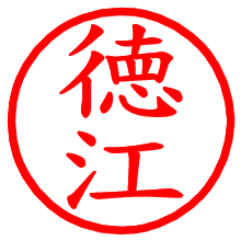 [朱肉の色]を選び、入力窓に“徳江”と入力して[生成]ボタンを押すと、印影が更新され、リンクから電子印鑑(デジタル印影)がダウンロードできます。 電子印鑑「徳江」の作り方文字表示が変なときや、文字バランスが悪いときは[字形切替]のチェックボックスでON/OFFを切り替え[生成]しなおしてください。 生成される画像は通常の印影「徳江.png」と、にじみを表現した少し太めの印影「徳江B.png」の背面透過PNG形式2種と、鮮明なPDF形式の印影「徳江.pdf」の計3種類です。 朱肉の微妙な色の違いを7色で表現しました。デフォルト(左端)は、JISが定めた朱肉の色のマンセル値(7.5R 5/14)をRGB値(217,66,54)に変換したものになっています。 「電子透かし」にチェックを入れて[生成]ボタンを押すと、タイムスタンプを透かしとして埋め込んだセキュアな電子印鑑が作れます。詳細は別ページの「電子透かしとタイムスタンプ」でご覧ください。 徳江さんの日付印が作れます。「日付スタンプメーカー」は、社内向けの書類に利用されることの多い日付印(データ印)が無料で作れるWebアプリケーションです。中段に日付が入り、上段と下段は、ともに8文字まで文字が入ります。 ![]() 古代文字で落款印が作れます。「落款スタンプメーカー」で作品を引き立たせる落款印が作れます。