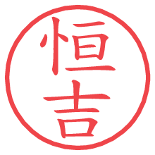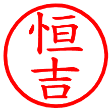 [朱肉の色]を選び、入力窓に“恒吉”と入力して[生成]ボタンを押すと、印影が更新され、リンクから電子印鑑(デジタル印影)がダウンロードできます。 電子印鑑「恒吉」の作り方文字表示が変なときや、文字バランスが悪いときは[字形切替]のチェックボックスでON/OFFを切り替え[生成]しなおしてください。 生成される画像は通常の印影「恒吉.png」と、にじみを表現した少し太めの印影「恒吉B.png」の背面透過PNG形式2種と、鮮明なPDF形式の印影「恒吉.pdf」の計3種類です。 朱肉の微妙な色の違いを7色で表現しました。デフォルト(左端)は、JISが定めた朱肉の色のマンセル値(7.5R 5/14)をRGB値(217,66,54)に変換したものになっています。 「電子透かし」にチェックを入れて[生成]ボタンを押すと、タイムスタンプを電子透かしとして埋め込んだセキュアな電子印鑑が作れます。詳細は別ページの「タイムスタンプと電子透かし」でご覧ください。 恒吉さんの日付印が作れます。「日付スタンプメーカー」は、社内向けの書類に利用されることの多い日付印(データ印)が無料で作れるWebアプリケーションです。中段に日付が入り、上段と下段は、ともに8文字まで文字が入ります。 ![]() 古代文字で落款印が作れます。「落款スタンプメーカー」で作品を引き立たせる落款印が作れます。