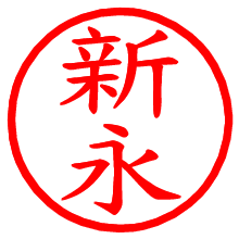 [朱肉の色]を選び、入力窓に“新永”と入力して[生成]ボタンを押すと、印影が更新され、リンクから電子印鑑(デジタル印影)がダウンロードできます。 電子印鑑「新永」の作り方文字表示が変なときや、文字バランスが悪いときは[字形切替]のチェックボックスでON/OFFを切り替え[生成]しなおしてください。 生成される画像は通常の印影「新永.png」と、にじみを表現した少し太めの印影「新永B.png」の背面透過PNG形式2種と、鮮明なPDF形式の印影「新永.pdf」の計3種類です。 朱肉の微妙な色の違いを7色で表現しました。デフォルト(左端)は、JISが定めた朱肉の色のマンセル値(7.5R 5/14)をRGB値(217,66,54)に変換したものになっています。 「電子透かし」にチェックを入れて[生成]ボタンを押すと、タイムスタンプを透かしとして埋め込んだセキュアな電子印鑑が作れます。詳細は別ページの「電子透かしとタイムスタンプ」でご覧ください。 新永さんの日付印が作れます。「日付スタンプメーカー」は、社内向けの書類に利用されることの多い日付印(データ印)が無料で作れるWebアプリケーションです。中段に日付が入り、上段と下段は、ともに8文字まで文字が入ります。 ![]() 古代文字で落款印が作れます。「落款スタンプメーカー」で作品を引き立たせる落款印が作れます。