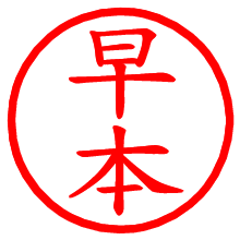 [朱肉の色]を選び、入力窓に“早本”と入力して[生成]ボタンを押すと、印影が更新され、リンクから電子印鑑(デジタル印影)がダウンロードできます。 電子印鑑「早本」の作り方文字表示が変なときや、文字バランスが悪いときは[字形切替]のチェックボックスでON/OFFを切り替え[生成]しなおしてください。 生成される画像は通常の印影「早本.png」と、にじみを表現した少し太めの印影「早本B.png」の背面透過PNG形式2種と、鮮明なPDF形式の印影「早本.pdf」の計3種類です。 朱肉の微妙な色の違いを7色で表現しました。デフォルト(左端)は、JISが定めた朱肉の色のマンセル値(7.5R 5/14)をRGB値(217,66,54)に変換したものになっています。 「電子透かし」にチェックを入れて[生成]ボタンを押すと、タイムスタンプを電子透かしとして埋め込んだセキュアな電子印鑑が作れます。詳細は別ページの「タイムスタンプと電子透かし」でご覧ください。 早本さんの日付印が作れます。「日付スタンプメーカー」は、社内向けの書類に利用されることの多い日付印(データ印)が無料で作れるWebアプリケーションです。中段に日付が入り、上段と下段は、ともに8文字まで文字が入ります。 ![]() 古代文字で落款印が作れます。「落款スタンプメーカー」で作品を引き立たせる落款印が作れます。