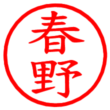 [朱肉の色]を選び、入力窓に“春野”と入力して[生成]ボタンを押すと、印影が更新され、リンクから電子印鑑(デジタル印影)がダウンロードできます。 電子印鑑「春野」の作り方文字表示が変なときや、文字バランスが悪いときは[字形切替]のチェックボックスでON/OFFを切り替え[生成]しなおしてください。 生成される画像は通常の印影「春野.png」と、にじみを表現した少し太めの印影「春野B.png」の背面透過PNG形式2種と、鮮明なPDF形式の印影「春野.pdf」の計3種類です。 朱肉の微妙な色の違いを7色で表現しました。デフォルト(左端)は、JISが定めた朱肉の色のマンセル値(7.5R 5/14)をRGB値(217,66,54)に変換したものになっています。 「電子透かし」にチェックを入れて[生成]ボタンを押すと、タイムスタンプを電子透かしとして埋め込んだセキュアな電子印鑑が作れます。詳細は別ページの「タイムスタンプと電子透かし」でご覧ください。 春野さんの日付印が作れます。「日付スタンプメーカー」は、社内向けの書類に利用されることの多い日付印(データ印)が無料で作れるWebアプリケーションです。中段に日付が入り、上段と下段は、ともに8文字まで文字が入ります。 ![]() 古代文字で落款印が作れます。「落款スタンプメーカー」で作品を引き立たせる落款印が作れます。