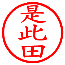 [朱肉の色]を選び、入力窓に“是此田”と入力して[生成]ボタンを押すと、印影が更新され、リンクから電子印鑑(デジタル印影)がダウンロードできます。 電子印鑑「是此田」の作り方文字表示が変なときや、文字バランスが悪いときは[字形切替]のチェックボックスでON/OFFを切り替え[生成]しなおしてください。 生成される画像は通常の印影「是此田.png」と、にじみを表現した少し太めの印影「是此田B.png」の背面透過PNG形式2種と、鮮明なPDF形式の印影「是此田.pdf」の計3種類です。 朱肉の微妙な色の違いを7色で表現しました。デフォルト(左端)は、JISが定めた朱肉の色のマンセル値(7.5R 5/14)をRGB値(217,66,54)に変換したものになっています。 「電子透かし」にチェックを入れて[生成]ボタンを押すと、タイムスタンプを透かしとして埋め込んだセキュアな電子印鑑が作れます。詳細は別ページの「電子透かしとタイムスタンプ」でご覧ください。 是此田さんの日付印が作れます。「日付スタンプメーカー」は、社内向けの書類に利用されることの多い日付印(データ印)が無料で作れるWebアプリケーションです。中段に日付が入り、上段と下段は、ともに8文字まで文字が入ります。 ![]() 古代文字で落款印が作れます。「落款スタンプメーカー」で作品を引き立たせる落款印が作れます。