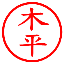 [朱肉の色]を選び、入力窓に“木平”と入力して[生成]ボタンを押すと、印影が更新され、リンクから電子印鑑(デジタル印影)がダウンロードできます。 電子印鑑「木平」の作り方文字表示が変なときや、文字バランスが悪いときは[字形切替]のチェックボックスでON/OFFを切り替え[生成]しなおしてください。 生成される画像は通常の印影「木平.png」と、にじみを表現した少し太めの印影「木平B.png」の背面透過PNG形式2種と、鮮明なPDF形式の印影「木平.pdf」の計3種類です。 朱肉の微妙な色の違いを7色で表現しました。デフォルト(左端)は、JISが定めた朱肉の色のマンセル値(7.5R 5/14)をRGB値(217,66,54)に変換したものになっています。 「電子透かし」にチェックを入れて[生成]ボタンを押すと、タイムスタンプを電子透かしとして埋め込んだセキュアな電子印鑑が作れます。詳細は別ページの「タイムスタンプと電子透かし」でご覧ください。 木平さんの日付印が作れます。「日付スタンプメーカー」は、社内向けの書類に利用されることの多い日付印(データ印)が無料で作れるWebアプリケーションです。中段に日付が入り、上段と下段は、ともに8文字まで文字が入ります。 ![]() 古代文字で落款印が作れます。「落款スタンプメーカー」で作品を引き立たせる落款印が作れます。