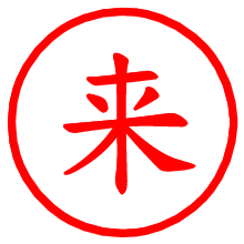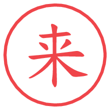 [朱肉の色]を選び、入力窓に“来”と入力して[生成]ボタンを押すと、印影が更新され、リンクから電子印鑑(デジタル印影)がダウンロードできます。 電子印鑑「来」の作り方文字表示が変なときや、文字バランスが悪いときは[字形切替]のチェックボックスでON/OFFを切り替え[生成]しなおしてください。 生成される画像は通常の印影「来.png」と、にじみを表現した少し太めの印影「来B.png」の背面透過PNG形式2種と、鮮明なPDF形式の印影「来.pdf」の計3種類です。 朱肉の微妙な色の違いを7色で表現しました。デフォルト(左端)は、JISが定めた朱肉の色のマンセル値(7.5R 5/14)をRGB値(217,66,54)に変換したものになっています。 「電子透かし」にチェックを入れて[生成]ボタンを押すと、タイムスタンプを電子透かしとして埋め込んだセキュアな電子印鑑が作れます。詳細は別ページの「タイムスタンプと電子透かし」でご覧ください。 来さんの日付印が作れます。「日付スタンプメーカー」は、社内向けの書類に利用されることの多い日付印(データ印)が無料で作れるWebアプリケーションです。中段に日付が入り、上段と下段は、ともに8文字まで文字が入ります。 ![]() 古代文字で落款印が作れます。「落款スタンプメーカー」で作品を引き立たせる落款印が作れます。