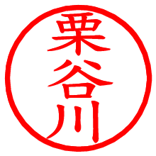 [朱肉の色]を選び、入力窓に“栗谷川”と入力して[生成]ボタンを押すと、印影が更新され、リンクから電子印鑑(デジタル印影)がダウンロードできます。 電子印鑑「栗谷川」の作り方文字表示が変なときや、文字バランスが悪いときは[字形切替]のチェックボックスでON/OFFを切り替え[生成]しなおしてください。 生成される画像は通常の印影「栗谷川.png」と、にじみを表現した少し太めの印影「栗谷川B.png」の背面透過PNG形式2種と、鮮明なPDF形式の印影「栗谷川.pdf」の計3種類です。 朱肉の微妙な色の違いを7色で表現しました。デフォルト(左端)は、JISが定めた朱肉の色のマンセル値(7.5R 5/14)をRGB値(217,66,54)に変換したものになっています。 「電子透かし」にチェックを入れて[生成]ボタンを押すと、タイムスタンプを電子透かしとして埋め込んだセキュアな電子印鑑が作れます。詳細は別ページの「タイムスタンプと電子透かし」でご覧ください。 栗谷川さんの日付印が作れます。「日付スタンプメーカー」は、社内向けの書類に利用されることの多い日付印(データ印)が無料で作れるWebアプリケーションです。中段に日付が入り、上段と下段は、ともに8文字まで文字が入ります。 ![]() 古代文字で落款印が作れます。「落款スタンプメーカー」で作品を引き立たせる落款印が作れます。
