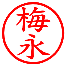 [朱肉の色]を選び、入力窓に“梅永”と入力して[生成]ボタンを押すと、印影が更新され、リンクから電子印鑑(デジタル印影)がダウンロードできます。 電子印鑑「梅永」の作り方文字表示が変なときや、文字バランスが悪いときは[字形切替]のチェックボックスでON/OFFを切り替え[生成]しなおしてください。 生成される画像は通常の印影「梅永.png」と、にじみを表現した少し太めの印影「梅永B.png」の背面透過PNG形式2種と、鮮明なPDF形式の印影「梅永.pdf」の計3種類です。 朱肉の微妙な色の違いを7色で表現しました。デフォルト(左端)は、JISが定めた朱肉の色のマンセル値(7.5R 5/14)をRGB値(217,66,54)に変換したものになっています。 「電子透かし」にチェックを入れて[生成]ボタンを押すと、タイムスタンプを電子透かしとして埋め込んだセキュアな電子印鑑が作れます。詳細は別ページの「タイムスタンプと電子透かし」でご覧ください。 梅永さんの日付印が作れます。「日付スタンプメーカー」は、社内向けの書類に利用されることの多い日付印(データ印)が無料で作れるWebアプリケーションです。中段に日付が入り、上段と下段は、ともに8文字まで文字が入ります。 ![]() 古代文字で落款印が作れます。「落款スタンプメーカー」で作品を引き立たせる落款印が作れます。
