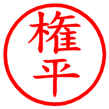 [朱肉の色]を選び、入力窓に“権平”と入力して[生成]ボタンを押すと、印影が更新され、リンクから電子印鑑(デジタル印影)がダウンロードできます。 電子印鑑「権平」の作り方文字表示が変なときや、文字バランスが悪いときは[字形切替]のチェックボックスでON/OFFを切り替え[生成]しなおしてください。 生成される画像は通常の印影「権平.png」と、にじみを表現した少し太めの印影「権平B.png」の背面透過PNG形式2種と、鮮明なPDF形式の印影「権平.pdf」の計3種類です。 朱肉の微妙な色の違いを7色で表現しました。デフォルト(左端)は、JISが定めた朱肉の色のマンセル値(7.5R 5/14)をRGB値(217,66,54)に変換したものになっています。 「電子透かし」にチェックを入れて[生成]ボタンを押すと、タイムスタンプを電子透かしとして埋め込んだセキュアな電子印鑑が作れます。詳細は別ページの「タイムスタンプと電子透かし」でご覧ください。 権平さんの日付印が作れます。「日付スタンプメーカー」は、社内向けの書類に利用されることの多い日付印(データ印)が無料で作れるWebアプリケーションです。中段に日付が入り、上段と下段は、ともに8文字まで文字が入ります。 ![]() 古代文字で落款印が作れます。「落款スタンプメーカー」で作品を引き立たせる落款印が作れます。