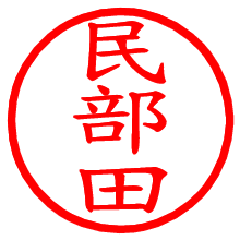 [朱肉の色]を選び、入力窓に“民部田”と入力して[生成]ボタンを押すと、印影が更新され、リンクから電子印鑑(デジタル印影)がダウンロードできます。 電子印鑑「民部田」の作り方文字表示が変なときや、文字バランスが悪いときは[字形切替]のチェックボックスでON/OFFを切り替え[生成]しなおしてください。 生成される画像は通常の印影「民部田.png」と、にじみを表現した少し太めの印影「民部田B.png」の背面透過PNG形式2種と、鮮明なPDF形式の印影「民部田.pdf」の計3種類です。 朱肉の微妙な色の違いを7色で表現しました。デフォルト(左端)は、JISが定めた朱肉の色のマンセル値(7.5R 5/14)をRGB値(217,66,54)に変換したものになっています。 「電子透かし」にチェックを入れて[生成]ボタンを押すと、タイムスタンプを電子透かしとして埋め込んだセキュアな電子印鑑が作れます。詳細は別ページの「タイムスタンプと電子透かし」でご覧ください。 民部田さんの日付印が作れます。「日付スタンプメーカー」は、社内向けの書類に利用されることの多い日付印(データ印)が無料で作れるWebアプリケーションです。中段に日付が入り、上段と下段は、ともに8文字まで文字が入ります。 ![]() 古代文字で落款印が作れます。「落款スタンプメーカー」で作品を引き立たせる落款印が作れます。