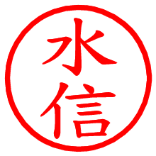 [朱肉の色]を選び、入力窓に“水信”と入力して[生成]ボタンを押すと、印影が更新され、リンクから電子印鑑(デジタル印影)がダウンロードできます。 電子印鑑「水信」の作り方文字表示が変なときや、文字バランスが悪いときは[字形切替]のチェックボックスでON/OFFを切り替え[生成]しなおしてください。 生成される画像は通常の印影「水信.png」と、にじみを表現した少し太めの印影「水信B.png」の背面透過PNG形式2種と、鮮明なPDF形式の印影「水信.pdf」の計3種類です。 朱肉の微妙な色の違いを7色で表現しました。デフォルト(左端)は、JISが定めた朱肉の色のマンセル値(7.5R 5/14)をRGB値(217,66,54)に変換したものになっています。 「電子透かし」にチェックを入れて[生成]ボタンを押すと、タイムスタンプを電子透かしとして埋め込んだセキュアな電子印鑑が作れます。詳細は別ページの「タイムスタンプと電子透かし」でご覧ください。 水信さんの日付印が作れます。「日付スタンプメーカー」は、社内向けの書類に利用されることの多い日付印(データ印)が無料で作れるWebアプリケーションです。中段に日付が入り、上段と下段は、ともに8文字まで文字が入ります。 ![]() 古代文字で落款印が作れます。「落款スタンプメーカー」で作品を引き立たせる落款印が作れます。