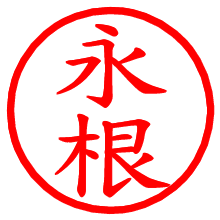 [朱肉の色]を選び、入力窓に“永根”と入力して[生成]ボタンを押すと、印影が更新され、リンクから電子印鑑(デジタル印影)がダウンロードできます。 電子印鑑「永根」の作り方文字表示が変なときや、文字バランスが悪いときは[字形切替]のチェックボックスでON/OFFを切り替え[生成]しなおしてください。 生成される画像は通常の印影「永根.png」と、にじみを表現した少し太めの印影「永根B.png」の背面透過PNG形式2種と、鮮明なPDF形式の印影「永根.pdf」の計3種類です。 朱肉の微妙な色の違いを7色で表現しました。デフォルト(左端)は、JISが定めた朱肉の色のマンセル値(7.5R 5/14)をRGB値(217,66,54)に変換したものになっています。 「電子透かし」にチェックを入れて[生成]ボタンを押すと、タイムスタンプを電子透かしとして埋め込んだセキュアな電子印鑑が作れます。詳細は別ページの「タイムスタンプと電子透かし」でご覧ください。 永根さんの日付印が作れます。「日付スタンプメーカー」は、社内向けの書類に利用されることの多い日付印(データ印)が無料で作れるWebアプリケーションです。中段に日付が入り、上段と下段は、ともに8文字まで文字が入ります。 ![]() 古代文字で落款印が作れます。「落款スタンプメーカー」で作品を引き立たせる落款印が作れます。