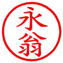 [朱肉の色]を選び、入力窓に“永翁”と入力して[生成]ボタンを押すと、印影が更新され、リンクから電子印鑑(デジタル印影)がダウンロードできます。 電子印鑑「永翁」の作り方文字表示が変なときや、文字バランスが悪いときは[字形切替]のチェックボックスでON/OFFを切り替え[生成]しなおしてください。 生成される画像は通常の印影「永翁.png」と、にじみを表現した少し太めの印影「永翁B.png」の背面透過PNG形式2種と、鮮明なPDF形式の印影「永翁.pdf」の計3種類です。 朱肉の微妙な色の違いを7色で表現しました。デフォルト(左端)は、JISが定めた朱肉の色のマンセル値(7.5R 5/14)をRGB値(217,66,54)に変換したものになっています。 「電子透かし」にチェックを入れて[生成]ボタンを押すと、タイムスタンプを電子透かしとして埋め込んだセキュアな電子印鑑が作れます。詳細は別ページの「タイムスタンプと電子透かし」でご覧ください。 永翁さんの日付印が作れます。「日付スタンプメーカー」は、社内向けの書類に利用されることの多い日付印(データ印)が無料で作れるWebアプリケーションです。中段に日付が入り、上段と下段は、ともに8文字まで文字が入ります。 ![]() 古代文字で落款印が作れます。「落款スタンプメーカー」で作品を引き立たせる落款印が作れます。