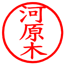 [朱肉の色]を選び、入力窓に“河原木”と入力して[生成]ボタンを押すと、印影が更新され、リンクから電子印鑑(デジタル印影)がダウンロードできます。 電子印鑑「河原木」の作り方文字表示が変なときや、文字バランスが悪いときは[字形切替]のチェックボックスでON/OFFを切り替え[生成]しなおしてください。 生成される画像は通常の印影「河原木.png」と、にじみを表現した少し太めの印影「河原木B.png」の背面透過PNG形式2種と、鮮明なPDF形式の印影「河原木.pdf」の計3種類です。 朱肉の微妙な色の違いを7色で表現しました。デフォルト(左端)は、JISが定めた朱肉の色のマンセル値(7.5R 5/14)をRGB値(217,66,54)に変換したものになっています。 「電子透かし」にチェックを入れて[生成]ボタンを押すと、タイムスタンプを電子透かしとして埋め込んだセキュアな電子印鑑が作れます。詳細は別ページの「タイムスタンプと電子透かし」でご覧ください。 河原木さんの日付印が作れます。「日付スタンプメーカー」は、社内向けの書類に利用されることの多い日付印(データ印)が無料で作れるWebアプリケーションです。中段に日付が入り、上段と下段は、ともに8文字まで文字が入ります。 ![]() 古代文字で落款印が作れます。「落款スタンプメーカー」で作品を引き立たせる落款印が作れます。