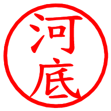 [朱肉の色]を選び、入力窓に“河底”と入力して[生成]ボタンを押すと、印影が更新され、リンクから電子印鑑(デジタル印影)がダウンロードできます。 電子印鑑「河底」の作り方文字表示が変なときや、文字バランスが悪いときは[字形切替]のチェックボックスでON/OFFを切り替え[生成]しなおしてください。 生成される画像は通常の印影「河底.png」と、にじみを表現した少し太めの印影「河底B.png」の背面透過PNG形式2種と、鮮明なPDF形式の印影「河底.pdf」の計3種類です。 朱肉の微妙な色の違いを7色で表現しました。デフォルト(左端)は、JISが定めた朱肉の色のマンセル値(7.5R 5/14)をRGB値(217,66,54)に変換したものになっています。 「電子透かし」にチェックを入れて[生成]ボタンを押すと、タイムスタンプを電子透かしとして埋め込んだセキュアな電子印鑑が作れます。詳細は別ページの「タイムスタンプと電子透かし」でご覧ください。 河底さんの日付印が作れます。「日付スタンプメーカー」は、社内向けの書類に利用されることの多い日付印(データ印)が無料で作れるWebアプリケーションです。中段に日付が入り、上段と下段は、ともに8文字まで文字が入ります。 ![]() 古代文字で落款印が作れます。「落款スタンプメーカー」で作品を引き立たせる落款印が作れます。