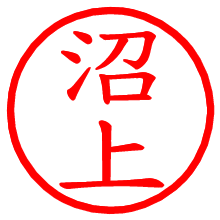 [朱肉の色]を選び、入力窓に“沼上”と入力して[生成]ボタンを押すと、印影が更新され、リンクから電子印鑑(デジタル印影)がダウンロードできます。 電子印鑑「沼上」の作り方文字表示が変なときや、文字バランスが悪いときは[字形切替]のチェックボックスでON/OFFを切り替え[生成]しなおしてください。 生成される画像は通常の印影「沼上.png」と、にじみを表現した少し太めの印影「沼上B.png」の背面透過PNG形式2種と、鮮明なPDF形式の印影「沼上.pdf」の計3種類です。 朱肉の微妙な色の違いを7色で表現しました。デフォルト(左端)は、JISが定めた朱肉の色のマンセル値(7.5R 5/14)をRGB値(217,66,54)に変換したものになっています。 「電子透かし」にチェックを入れて[生成]ボタンを押すと、タイムスタンプを電子透かしとして埋め込んだセキュアな電子印鑑が作れます。詳細は別ページの「タイムスタンプと電子透かし」でご覧ください。 沼上さんの日付印が作れます。「日付スタンプメーカー」は、社内向けの書類に利用されることの多い日付印(データ印)が無料で作れるWebアプリケーションです。中段に日付が入り、上段と下段は、ともに8文字まで文字が入ります。 ![]() 古代文字で落款印が作れます。「落款スタンプメーカー」で作品を引き立たせる落款印が作れます。