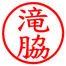 [朱肉の色]を選び、入力窓に“滝脇”と入力して[生成]ボタンを押すと、印影が更新され、リンクから電子印鑑(デジタル印影)がダウンロードできます。 電子印鑑「滝脇」の作り方文字表示が変なときや、文字バランスが悪いときは[字形切替]のチェックボックスでON/OFFを切り替え[生成]しなおしてください。 生成される画像は通常の印影「滝脇.png」と、にじみを表現した少し太めの印影「滝脇B.png」の背面透過PNG形式2種と、鮮明なPDF形式の印影「滝脇.pdf」の計3種類です。 朱肉の微妙な色の違いを7色で表現しました。デフォルト(左端)は、JISが定めた朱肉の色のマンセル値(7.5R 5/14)をRGB値(217,66,54)に変換したものになっています。 「電子透かし」にチェックを入れて[生成]ボタンを押すと、タイムスタンプを電子透かしとして埋め込んだセキュアな電子印鑑が作れます。詳細は別ページの「タイムスタンプと電子透かし」でご覧ください。 滝脇さんの日付印が作れます。「日付スタンプメーカー」は、社内向けの書類に利用されることの多い日付印(データ印)が無料で作れるWebアプリケーションです。中段に日付が入り、上段と下段は、ともに8文字まで文字が入ります。 ![]() 古代文字で落款印が作れます。「落款スタンプメーカー」で作品を引き立たせる落款印が作れます。
